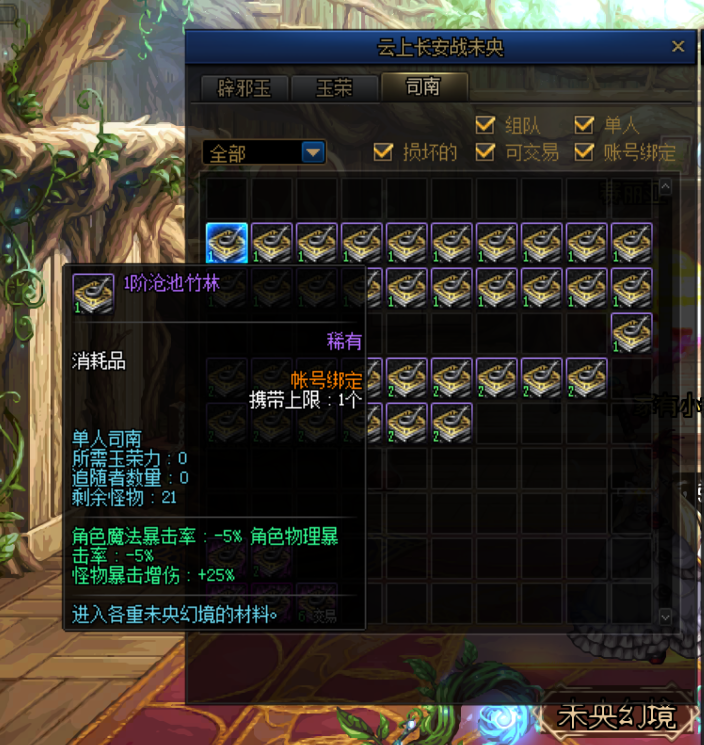 利用司南为账绑的特性,我们可以利用装备较差的小号去清理1阶门票,有点普雷装备或者100级传说的可以打2~3阶,100级史诗半毕业的可以打4~5阶,最后全身100级史诗并且有5~6个词条的,就可以打更高阶的司南了。