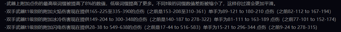 武器上附加点伤的最高级词缀被提高了8%的数值,低级词缀提高了更多。不同t级的词缀数值差距被缩小了,这样你过渡会更加平滑。