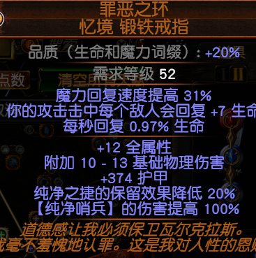 ![]() 戒指: 绑定戒指 罪恶之环-锻铁戒指 ,这里强调一点,戒指必须带这条属性”纯净之捷魔力保留降低“,这个赛季可以打催化剂让魔力保留更高,2个戒指加起来有78就可以了,是2个哈,这样你的蓝肯定就够了,另外一条属性看个人喜欢,我选择的是 纯净哨兵的范围扩大。 大佬请指点下啊!戒指是传奇戒指吧?直接用丰沃催化剂把品质堆到20%就行了吗??其他接下来做啥啊?是不是戒指这样就好了哦?? 本帖最后于 2021-7-28 07:47 编辑 |