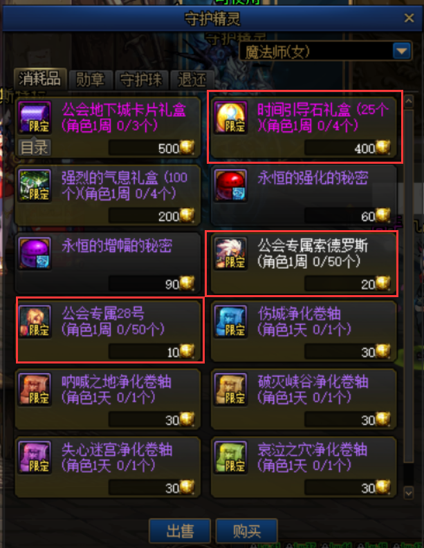 公会改版最为直观的当属奖励升级,在新版的守护精灵商店中,新增加了时间引导石礼盒(25个),每个角色每周可以换4次、此外还新增了索德罗斯人偶、28号人偶。在守护珠页面,新增加了神器守护珠礼盒,售价800公会硬币。