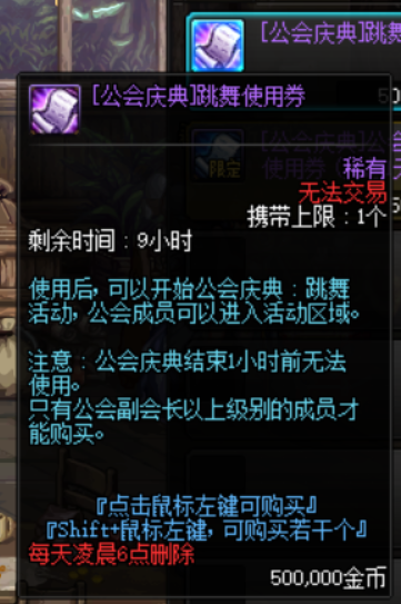 跳舞使用券需要公会会长与被赋予权力的公会成员购买,售价50W金币,使用跳舞使用券后,即可在公会大厅外部左侧的传送门中入场。