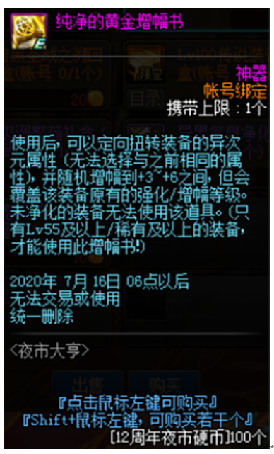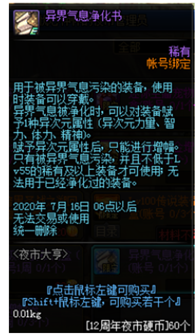 异界气息净化书(60个硬币),现版本需求量最大的道具之一,用来解除装备红字。如果装备的红字属性不是我们想要的,通过在诺顿处铭刻,我们也能将红字属性覆盖掉。