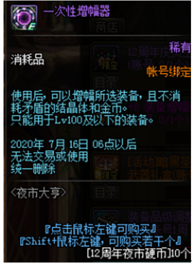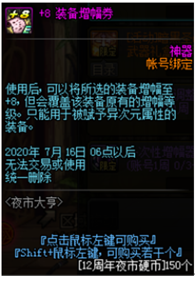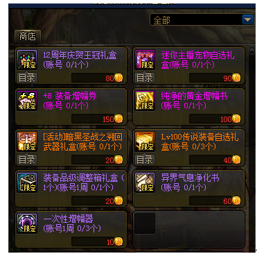纯净的黄金增幅书(100个硬币)和+8装备增幅券(150个硬币)是个人认为价值最大的两个道具。在目前版本红字已经不再像以前那么重要,不过通过活动我们也能轻松的拥有一身增幅10装备。配合每周可以兑换的一次性增幅器,没准我们还可以冲击下增幅10、增幅11。