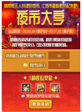 在店铺搭建、制作食物、销售食物、升级店铺、购买道具等过程中,我们都可以获得评分。当评分达到指定阶段后,就可以获得不同数量的12周年夜市硬币。