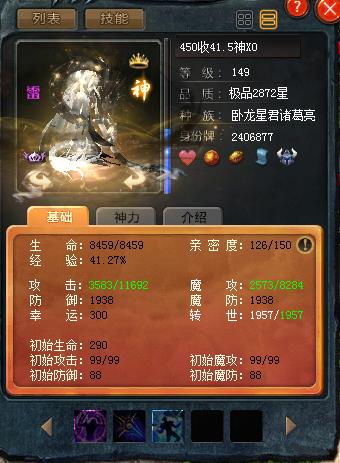 丞相祠堂何处寻,锦官城外柏森森。 映阶碧草自春色, 隔叶黄鹂空好音。 三顾频烦天下计,两朝开济老臣心。 出师未捷身先死,长使英雄泪满襟。 ——杜甫《蜀相》 诸葛亮是我们再熟悉不过的一个历史人物,他一直都是以睿智、机敏、运筹帷幄的形象存在于我们的脑海! 随着魔域全新分类英灵宠的问世!睿智、机敏、运筹帷幄的诸葛亮成为第一只加入魔域的历史人物! 比肩年兽的超强属性、光彩夺目的酷炫技能、实力暴涨的被动加成,使诸葛亮一出现就在魔域瞬间圈粉无数······ 但是仍旧有着一大批的玩家在观望着,毕竟,点亮七星灯,合成雷属性的诸葛亮是需要很大的成本的······ 机会是留给有准备的人,成功是属于那些敢于迈出脚步的人。 今天一人一宠,带来世界第一诸葛亮! 所在区服:疾风一区 拥有主人:大亡灵 先一睹世界第一诸葛亮的真容  属性如下: 生命:8459 攻击:3583/11692 魔攻:2753/8284 双防:1938 诸葛亮的属性跟白逍遥是一样的,大小攻击的差距比较大!生命成长一般般,因此整体血量比较少,毕竟攻击比较逆天。 这只诸葛亮还不是最完美的形态,攻击天赋还没有全部洗好! 但是对于大亡灵的实力,我想没有人会质疑的吧····· 诸葛亮的强大其实不是简简单单的攻击数据可以体现的,独特的属性加成,会大大的提升玩家的攻击! 在这个装备总和100属性已经不再震撼的年代,女神的加成以及诸葛亮所带来的属性的加成! 会使得玩家攻击呈现爆炸式的增长! 正所谓长江后浪推前浪,新出的幻兽在综合实力方面肯定是要强于以前的幻兽的! 诸葛亮的存在则大大的方便玩家的幻兽搭配选择,打破了魔域靠三只幻兽打天下格式! 各大攻击宠的出征调配,各种幻兽搭配,怎么样打出最高攻击,怎么样爆发出最高伤害,成为了魔民们争相讨论的话题! 大亡灵这只诸葛亮目前位列冲星赛的首榜首名  大亡灵整体的实力是非常强劲的,整个疾风一区的气氛非常好,两位大佬的带动下,疾风一区人气火爆! 虽然目前诸葛亮星级没有突破3000星,但是以大亡灵这个冲星的速度绝对会短时间内冲进3000星,然后一鼓作气飞速冲星! 其实小记觉得大亡灵契合诸葛亮,运筹帷幄在军中,决战神域百战功!