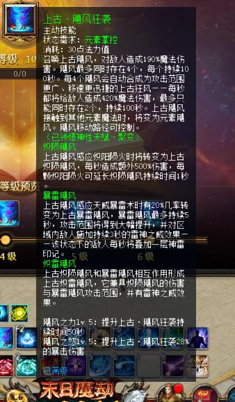 末日魔劫正式服上线已经快一个月了。官网公布的上古技能上线时间也临近了(官网消息是7月19日),那么作者这次也是找人借了个先锋区的法师进行测试。客观地讲,法师这个职业作为魔域初代远古级别的职业,当然也风光过,也没落过很长一段时间。 先看看本次法师上古技能调整内容:  可以看到法师此次调整是围绕主要输出技能旋风、火球、暴雷术进行,可见是有一定态度的 。火风百分百触发的,雷风概率触发。火风增伤,雷风增加范围并增加印记,雷火风那伤害就更不用说了。 游戏内技能描述:  然后我们看看游戏中技能描述 一丶火风是1个火球持1秒,如果按照描述的话,一分钟一般掐球的话10几个火球还是有的,多数时间是火风状态; 二丶雷风是暴雷时概率触发,20%概率触发,持续5秒,因为有雷火风的效果,所以这个形态上面显示一共有以下三种。 火风:  雷风:  雷火风:  技能酷炫是真没话说,效果这个东西其实太主观了,也没法言喻 ,因为火风占比其实比较高,且能通过掐球来实现爆发,加上法师本来远古职业,本次资料片,法师完整状态下(风、火、雷技能全满级,魂兽70*觉醒)对比版本前提升约33%-40% 左右吧我个人感觉.