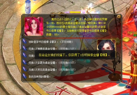 注:怀旧服为战斗力达到400的勇士每兑换2次真命宝藏可获得1份皇家节日徽章【赠】。活动期间同样每人最多只能获得3份皇家节日徽章【赠】。集齐4种已占卜过的塔罗牌可兑换真命宝藏——将有机会获得神缘同心结【赠】、80级原初之火【赠】、洗魄圣石【赠】、神祈之泪小礼袋【赠】等奖励。