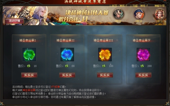 神圣幸运草Ⅳ:288点积分/每次。适用于各种等级幻兽的神圣幻化草,满足各位勇士的各种需求!决战神域冲冲冲~