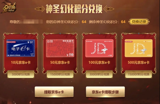 3、活动期间,累积神圣幻化积分还可在专属页面兑换京东e卡。