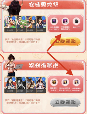 新一期集卡活动,集齐“安图恩攻坚”卡组可获得5个华丽的徽章随机礼盒,集齐“福利海量送”卡组可获得2个华丽的徽章自选礼盒。每天登陆游戏和分享活动可以获得4次的抽卡机会。