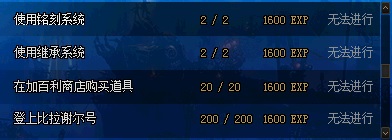 使用装备铭刻和继承系统、在加百利商店购买道具、登上比拉谢尔号、翻黄金卡牌和达成10个100级角色等非常简单的任务大约有11个,可以让小伙伴获得17600点经验,这样大约可以提升12个等级。