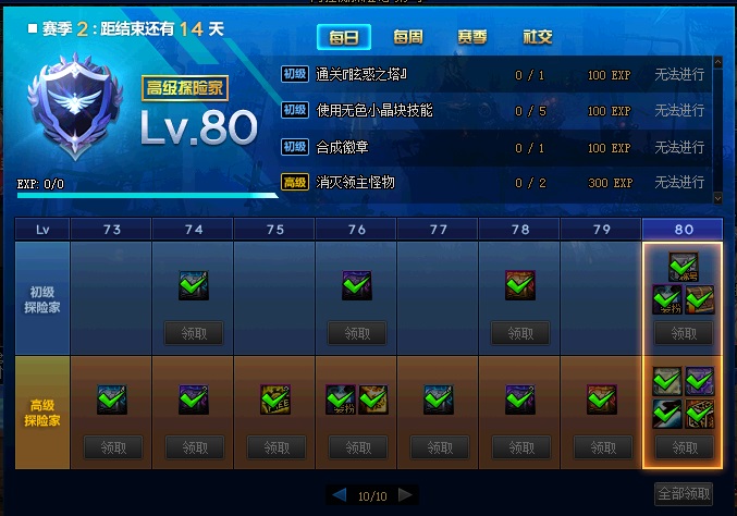 阿拉德探险记第二季总共有80级,经验依靠每日、每周、赛季和社交4种任务获得。其中4个每日任务完成可以获得600点经验,4个每周任务完成可以获得4000点经验,社交每天最多获得110点经验。这里笔者以最后一周为例,小伙伴们还可以通过每日、每周和社交任务获得8970点经验。