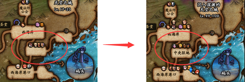 地图改动上主要集中在西海岸,对于没有开放洞察之眼复活圣殿的小伙伴,NPC罗杰、达芙妮、诺顿和奥兰奶奶都在独立的地图上,而在小伙伴们达到100级并开放洞察之眼复活圣殿之后,这些NPC将会从原处移出去。