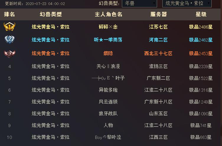 曾几何时黄金马也曾是新区玩家的首选 较高的罕见度,不凡的上星速度 较低的售价,使得黄金马在新区中如鱼得水,好不畅快! 万元号的出现,超高属性的紅鸡,白逍遥等一批神兽的问世 黄金马逐渐退下新区专宠的舞台! 历史会铭记这些辉煌,岁月会留下他们的故事! 今天小记用一期TOP 10来记录一下世界排名前十的黄金马! 看看当前黄金马的世界排名情况  当前世界第一黄金马是来自小记所在的江苏七区,有着2486星,世界第十名也有着663星,世界前十也有8只 黄金马超过1000星,实力还是比较不错的哦,下面就请出本期的十只明星幻兽! TOP 1:来自江苏七区2486星  TOP 2:来自河南二区 2462星  TOP 3:来自西北三十七区2453星  TOP 4:来自淮扬三区 2340星  TOP 5:来自广东新二区 1522星  TOP 6:来自江淮二十八区 1316星  TOP 7:来自广东新十八区 1249星  TOP 8:来自山东五区 1091星  TOP 9:来自江淮二十八区 741星  TOP 10:江西三区 663星  总结: 黄金马虽然已经难再有当初的辉煌了,但是雄风依旧,世界排名前四的黄金马星级差距非常之小,竞争也是非常激烈的。 世界第一的大皇冠每个人都想拥有! 可见本篇文章发表后,黄金马的排名必将有着新的变动!大家一起拭目以待!