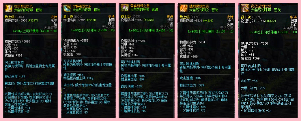 【1】超界防具,不论是什么甲类,都统一升级为100级板甲防具“大自然之息”套装,这套装备单位提升率排在5件套的第七位,其三件套散搭提升率排在第二位。