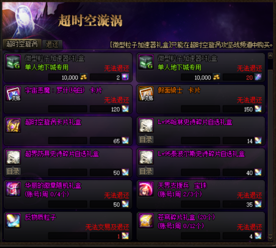 推荐优先兑换天界支援兵宝珠,该道具为平民附魔中最好的宝珠。若有多余的反物质粒子,推荐购买假面骑士卡片换金币。百级版本装备成型很快,超时空漩涡更多的是用于摸金和积攒不渝之咏,而非升级装备。