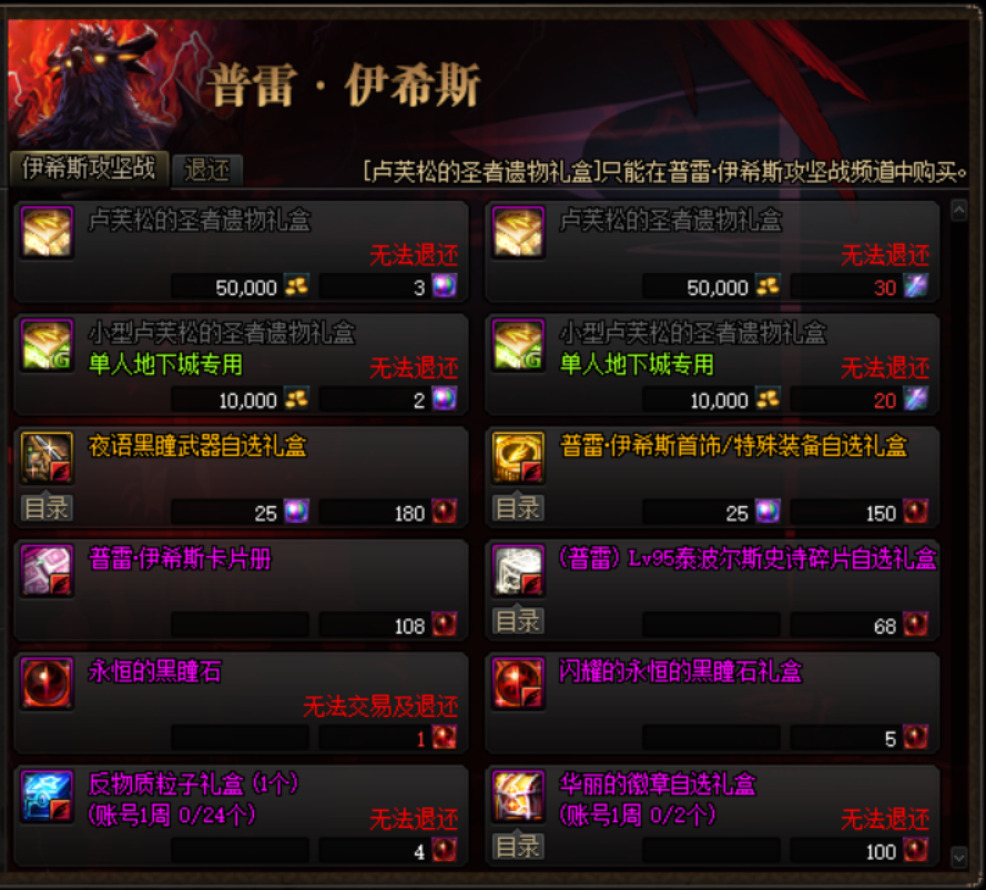 对于缺乏百级传说和普雷装备的小伙伴,推荐优先购买或者升级夜语黑瞳武器,次选华丽徽章自选礼盒,帮助小伙伴们打造装备。多余的永恒的黑瞳石可以兑换普雷·伊希斯卡片册或者囤积起来,等待未来攻坚商店更新。