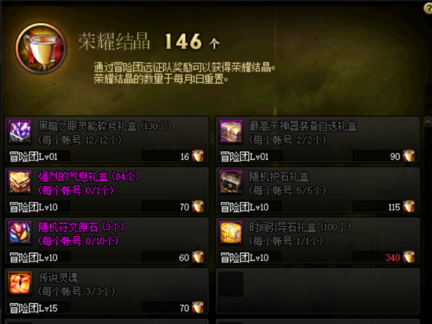 多余的材料可考虑兑换时间引导石礼盒、传说灵魂,固伤职业可兑换强烈的气息,帮助我们进行装备打造。不过,鉴于近期网页活动会赠送不少装备提升礼盒,荣耀结晶商店的强烈气息兑换优先级并不算太高。