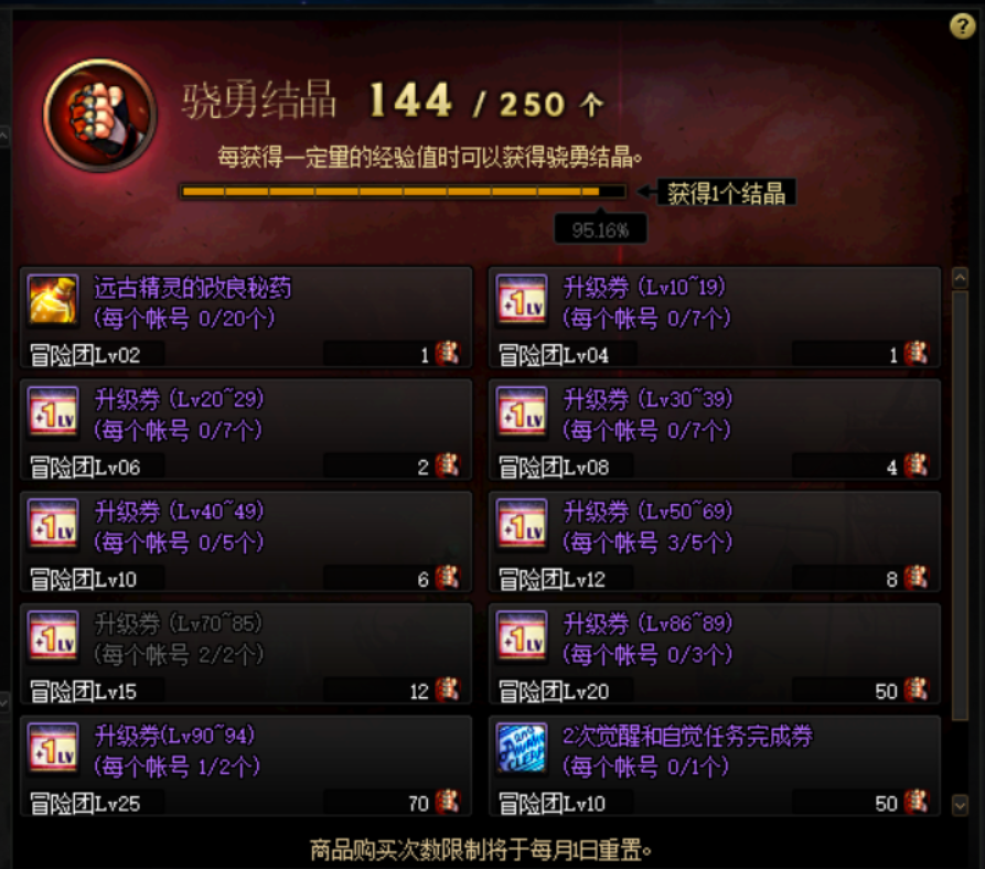 骁勇结晶可以通过获取经验值的同时积攒经验,经验槽满可获得一个骁勇结晶。骁勇结晶商店为升级券与二次觉醒、耳环、特殊装备、魔法石任务完成券。对于萌新和回归小伙伴而言,推荐优先兑换升级券与二次觉醒完成券,毕竟现在的DNF版本,满级才能体验到绝大部分游戏内容。
