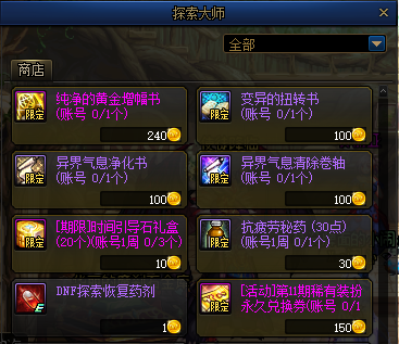 这个探索大师个人商店里面也有净化书和清除卷轴出售,可以花费100个DNF探索硬币购买,硬币获取难度不高,值得推荐。