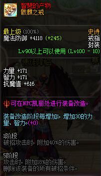 与骸驎之戒一样,可在装备2等1时用来过渡。改造1阶段直接获得40黄字的高性价比收益,提升极高。改造5阶段仅增加40属强,5阶段回报远远低于改造装备的付出,性价比极较低。