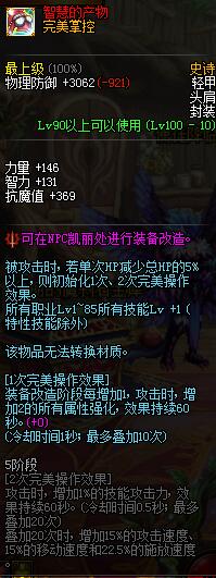 “完美掌控”为肩膀部位装备。自带属性1-85技能等级+1,改造1阶段最多增加40点属强,5阶段为增加120点属强、20技能攻击力以及3速的加成。这件装备的一个缺点是:五阶段前的加成较低,甚至不如同等级的传说装备。