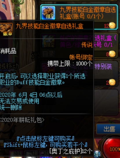 多次购买耕耘礼包后,可用奥丁之庇护兑换九界技能白金徽章自选礼盒。