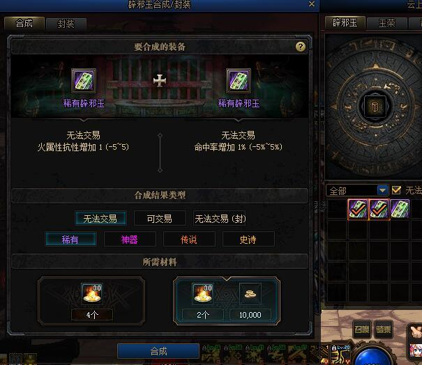 ·合成时不限制辟邪玉的品级、交易性质,换句话说稀有无法交易辟邪玉可以和神器封装辟邪玉进行合成。但需要注意,无法保证合成得到的辟邪玉的交易性质以及品级,这些都是随机的。