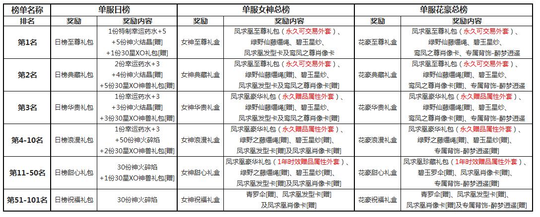 本次花魁赛的奖品攻略也是洋洋洒洒3大篇,包括全球女神总榜、日榜(线下+线上总粉玫瑰数);单服女神总榜、日榜(仅记录线上即游戏内收到的粉玫瑰数量);单服花豪总榜、日榜(仅记录线上即游戏内送出的粉玫瑰数量)。各种礼盒、礼箱、礼包,相信大家也会觉得头大,所以老规矩,用表格说话。