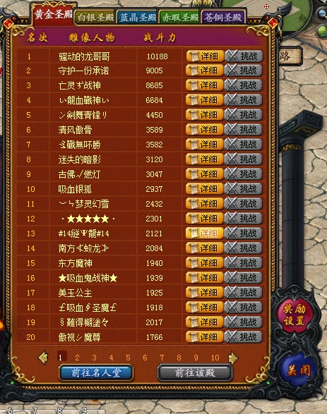 原来黑一的战力也是很强大的,战力成阶梯型,名人堂最高战10188,其次9000+,8000+,6000+,4000+,3000+的都有,显然这个区的整体实力是很不一般的。虽然顶级战力不是十分超群,但是也是比较有名气的,其次就是整体的战力比较强大,不像很多的老区除了一两个高战,剩下的就是2000+,3000+的玩家了。