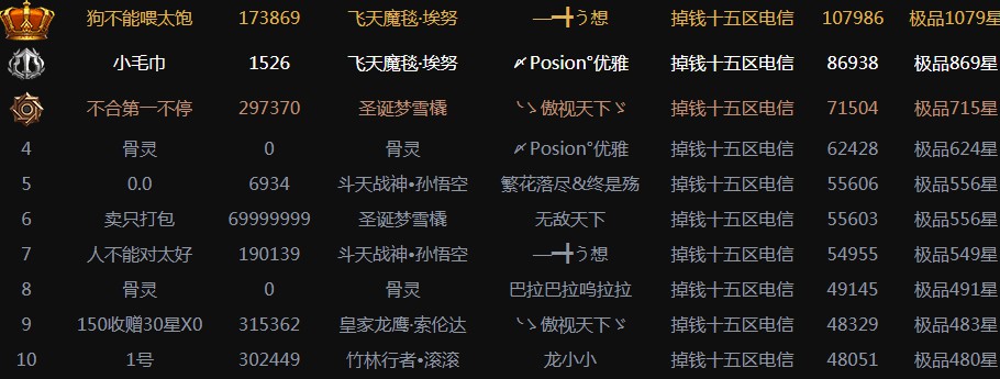 如上:前十名幻兽,1000星以上1只,800星以上1只,500星以上4只,400星以上3只。要知道掉钱版人口基数小,这十五小区也有破千星的幻兽,相当不错了!