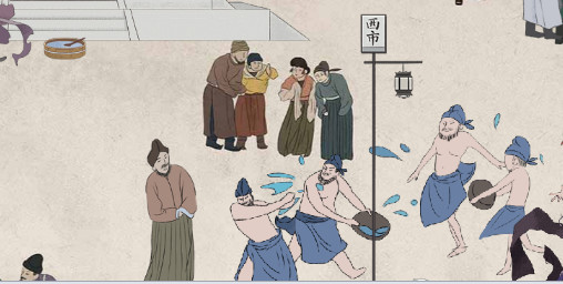 平准署是设在东市负责掌理市场及物价事务的,国家可以通过它掌握市场上关于民生类商品的价格杠杆,比如说粮食,通过买卖不断调节着生产、流通、消费之间的关系,从而保持经济的繁荣和稳定。平准署是国家机构,类似于今天的物价局和工商局,所以它的门前才站着身披铠甲的士兵,门框上的旗子上写着官府两字,为我们展现出大唐的威仪。
