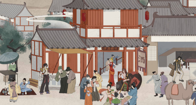 在唐代“胡人”一般是指波斯和中亚人种,而胡姬则是指胡人酒店中的卖酒女,后来泛指酒店中卖酒的女子。在万国来朝的唐代,丝绸之路正处在黄金时期,繁华的唐都长安处处可见胡人,人们对异质文化的态度也理性。歪果仁开的酒馆当然不可能只卖“杜康”,他们主要售卖的是葡萄酒。虽说葡萄从汉代传入我国,但却在唐朝借酒肆之手发扬光大,当时不知多少文人墨客倾倒胡姬舞裙和葡萄美酒之下,诗仙李白在《少年行》中有云:“ 落花踏尽游何处,笑入胡姬酒肆中。”这可是一番别样的唐风。