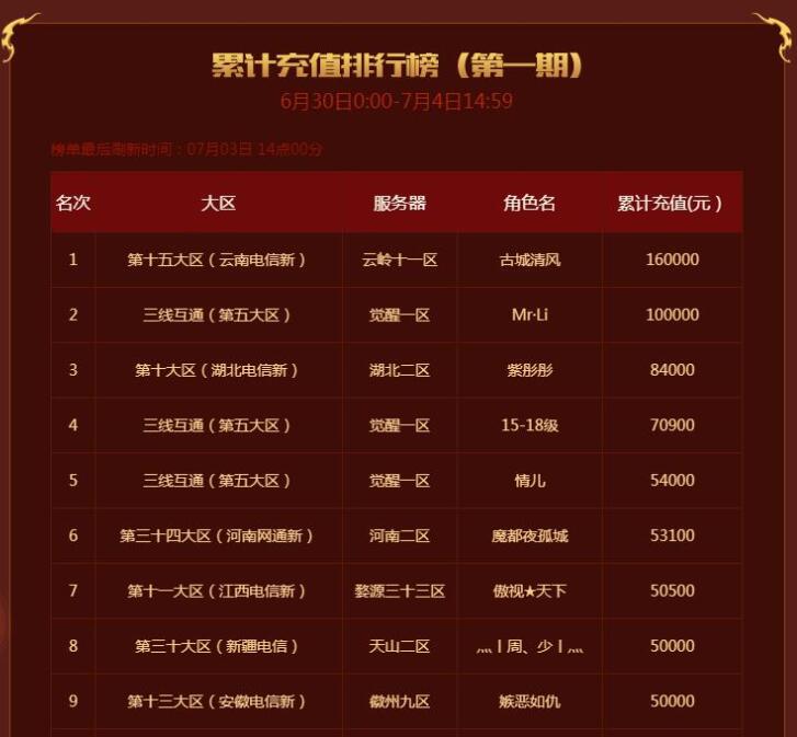 排名第一的神壕已经累计充值了16W,能否将这个第一的位置保持到最后呢,我们拭目以待!!!