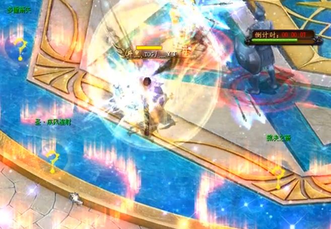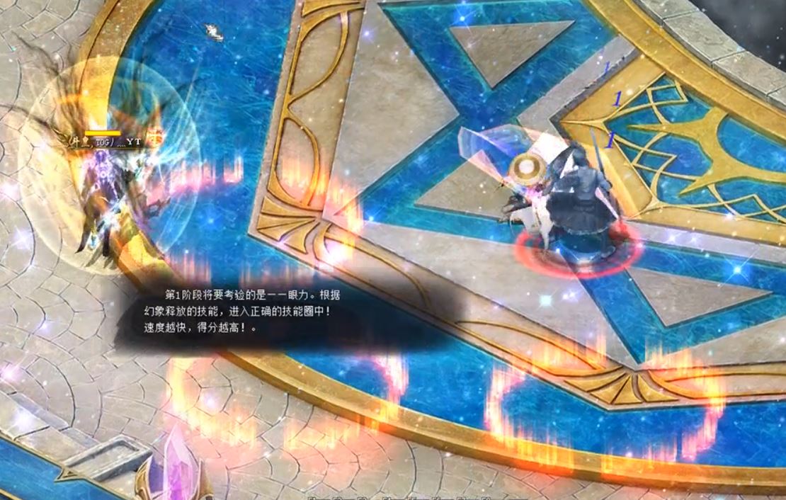 在NPC的下方,3个圈显示的技能名字会出现,玩家需要走入正确的圈获得积分。