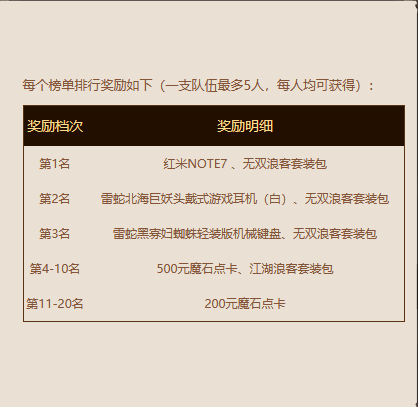 4、荣登榜单前3名的队伍即可坐拥江湖浪客·盖世外观(包含光效时装、发型卡、肖像卡),榜单4至10名荣获江湖浪客外观(包含无光效时装、发型卡、肖像卡)