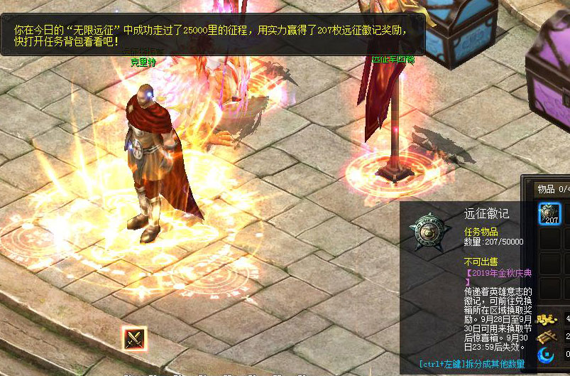 无数年前,不屈的人族英雄们,踏过滴血黎明,走上远征之路,终得人魔之战的胜利。为了纪念先辈的伟业,感念先辈的付出和奉献,在10月1日至10月10日金秋庆典期间,王国将带领达到90级的冒险者们远征,以此纪念与铭记伟大的远征精神,斩获丰厚战利品!若你对此有兴趣,就去找卡诺萨城的远征指挥官克里特(344,395)吧! 注:先锋区的活动时间为2019年9月18日至2019年9月27日。 不忘先辈远征精神的冒险者们,每日可以无限次地远征,在一路过关斩将感受当年艰难的同时,不断磨砺自我,最后可凭每日最佳成绩在远征指挥官克里特处领取丰厚奖励! 刚踏入远征之路时,可不要忘记先去试炼之剑处选择领取至多5份的远征补给品,为本次远征增加助力!如果不喜欢当前批次的补给品,还可以使用魔石更换新一批的补给品进行选择哦。(点击查看“远征补给品一览表”活动攻略) 领取完补给品,就可以开始通过试炼之剑测试出自己的神火评分,每次进入远征之路,你都可以在之前已有的最佳成绩的基础上开始测试。根据评分结果,你可前往对应里程的战场中开始远征之途。 在远征的第13500里、18150里、22150里、23650里、24650里、24900里、25000里时,都设有一个试炼召唤阵,启动召唤阵,能力强大的远征试炼官将来到你的面前,对你进行严酷的考验! 通过远征试炼官的考验,不仅可以斩获丰厚的奖励,而且还能获得一次性向前冲刺奖励。 通过考验的时间越短,一次性向前冲刺的里程越多,超过3分钟完成则直接进入下一里路程,超过5分钟完成则失败。 接受考验时你已经行进的里程越多,通过考验后奖励的冲刺里程就越少。 另外,不用担心,因为出色完成考验,获得冲刺而跳过的里程段奖励并没有被遗漏,你可以在领奖时一并领取。 除以上特殊里程点外,在远征之路其它里程点的战场中,你将遇到远征试炼使者的考验,如果运气好的话你还有可能触发随机事件,让你感受远征路上遇到的各种艰难。(点击查看“随机事件”活动攻略) 历经一路艰难,终于完成了25000里远征,这时荣耀之境将为你开启。进入荣耀之境,你可以点亮远征胜利旗帜的荣光,获得“远征英雄”的称号。 参与远征之路即可获得珍贵的远征徽记。 凡参与远征者都可在初级兑换箱处使用远征徽记兑换奖励。 远征成绩有达到18150里者可在中级兑换箱处使用远征徽记兑换奖励。 远征成绩有达到23650里者可在高级兑换箱处使用远征徽记兑换奖励。 还在等什么呢,快整装待发,集满勇气与毅力远征,用忆苦思甜的特殊方式,度过这个会给你留下深刻回忆的金秋庆典吧! |