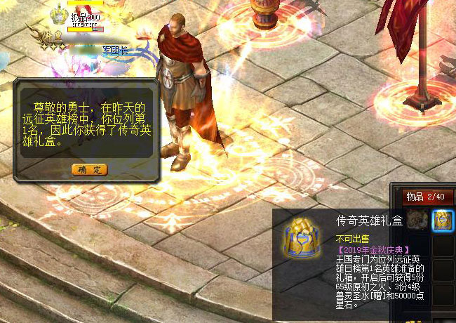 说明:【2019年金秋庆典】王国专门为位列远征英雄日榜第1名英雄准备的礼箱,开启后可获得3份65级原初之火、5份30星XO神兽礼包[赠]与30000点星石。