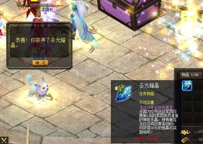 说明:【2019年金秋庆典】王国为位列远征军团日榜第2名的军团成员准备的神奇水晶,持有者在当日完成日常活动时,可获得20%的恒晶石奖励加成。