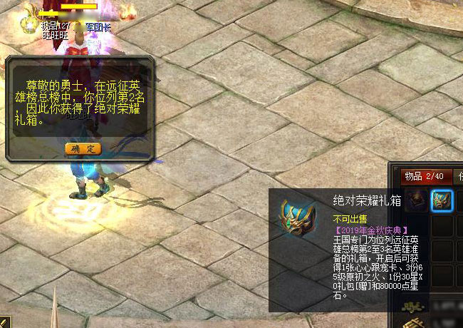说明:【2019年金秋庆典】王国专门为位列远征英雄总榜第2至3名英雄准备的礼箱,开启后可获得1份心心跟宠卡、2份19星XO礼包[赠]、5份特制经验球宝袋[赠]。