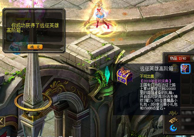 说明:【2019年金秋庆典】王国专门为在远征之路上累计里程达到40000里的英雄准备的礼箱,开启后可获得1份12星XO礼包[赠]与500点恒晶石。