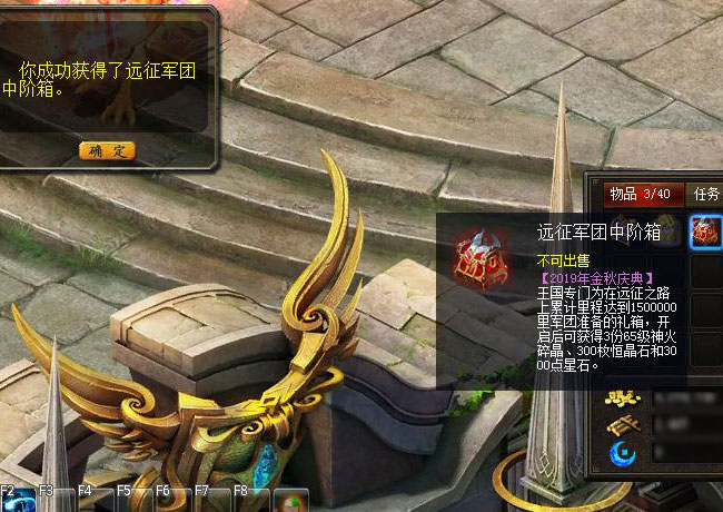 说明:【2019年金秋庆典】王国专门为在远征之路上累计里程达到3000000里的军团准备的礼箱,开启后可获得1份8星O型幻兽礼包[赠]、5份魔魂晶石小礼包、5份幻魔晶石小礼包。
