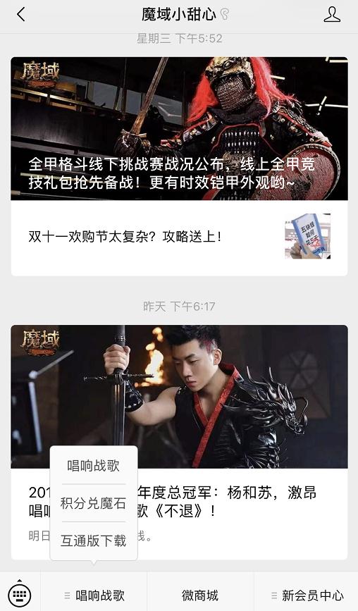 1、微信公众号关注小甜心,左下角选择“唱响战歌”