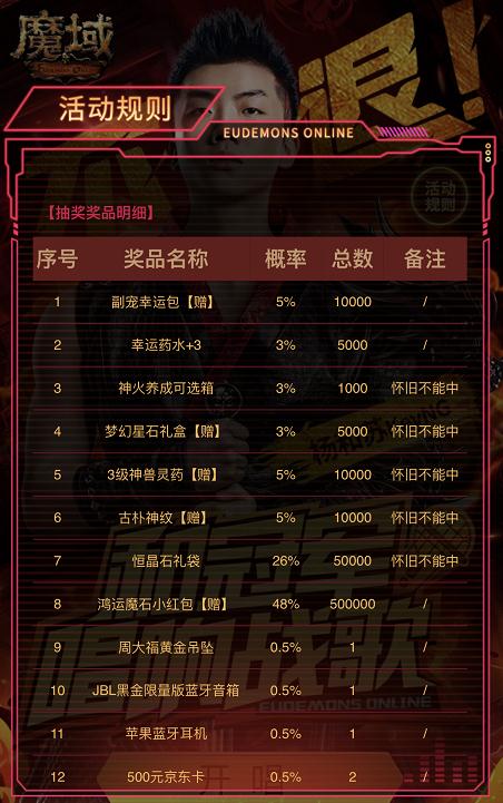 这次活动的奖品也是十分丰富呢,不仅有游戏中的各种道具,还可能抽到周大福珠宝、京东卡和限量版蓝牙音箱等!具体的概率请看下图: