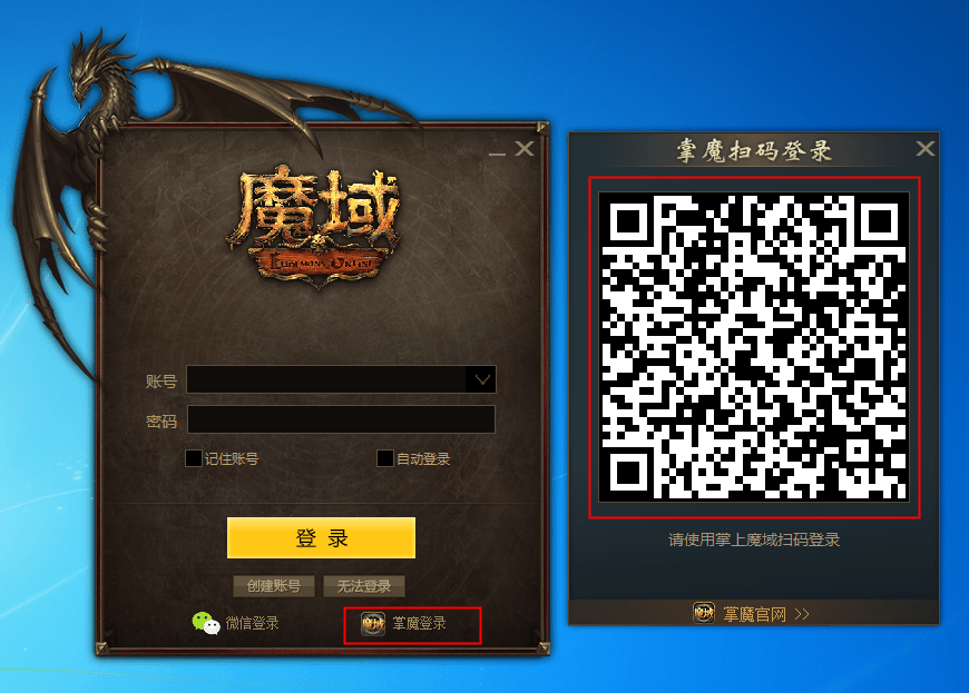 3、点击“掌魔登录”,在右侧即会出现二维码,使用掌上魔域扫码后,即可轻松登录到平台界面。  第二步:选择版本平台界面右侧可选择“魔域正式版”与“魔域先锋版”。 选择“魔域正式版”后可在主区域选择“正式版”与“特别版”,其中“特别版”即“魔域”的特色服,选择任意一个特色服即可畅游体验精彩纷呈的特色版本。 (注:“特别版”需要下载“正式版”才能运行。)  第三步:选择区服1、平台界面下方为“区服选择栏”,登录平台会自动记忆你前一次使用的服务器,让你在下次登录游戏的时候,不需再重新选择。