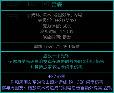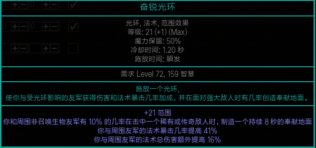 这里提示尽量把所有技能石的级别,依据自己的能力往最高等级和品质搞,赋予一定要4级。启蒙最好是4级(不是4级需要在天赋上多点魔力保留,或者用空向),这样你才可以多开一个25%保留光环。如果你不用吞噬者王冠那一套的话,就可以不必多开太多光环,能保证开到雷霆+奋锐的大增伤光环,尽力去找魔力保留多开一个纪律,会更舒服一点。就可以了。