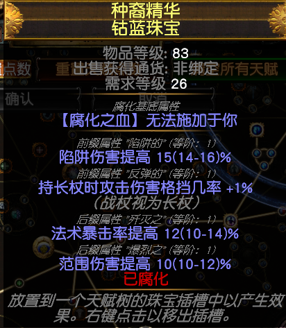 当你的暴击率组件(当你有钱买瓶中信仰)齐备,下掉提高暴击几率也有将近100%暴击时,就可以把提高暴击几率换成一个伤害辅助石头,这里我比较推荐闪电穿透,可以让我们面对T17-T18-T19的BOSS战时有良好表现,因为诅咒的效用对以上三个BOSS都大额度衰减(衰减66%),并且这些BOSS都自带50%元素抗性。
