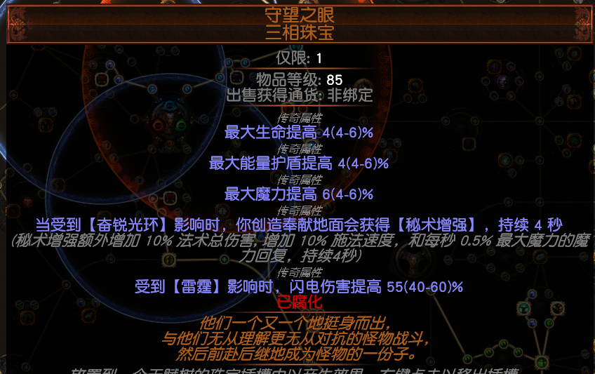 项链就圣战底子的项链,所有闪电技能石+1,搭配一条T1后缀雷霆/纪律魔力保留降低,让我们可以多开一个纪律,在点了异能魔力+心灵升华的情况下,ES会变成魔力,掉血也有30%伤害交给ES承受,但是混沌伤害还是会打在血上,也算是稍微提高了点坦度,我们成型有5000左右血,1500左右护盾,勉强算得上比例合适,6500的有效血量,不至于瞬间被秒。