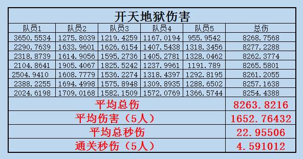 1、伤害:副本所需要的伤害是大家最关心的问题,毕竟要有足够的伤害才能通关地狱,才有机会遇到隐藏BOSS。小记统计了7个队伍的伤害,计算出开天地狱总伤害约为8264Y,通关总秒伤约为23Y,队伍中5位玩家每位平均需要对BOSS造成1653Y伤害,也就是秒伤至少需要达到4.6Y才能通关。(为保障稳定通关,平均秒伤需上浮0.2左右,也就是需要秒伤达到4.8左右,尤其是单体攻击职业~)