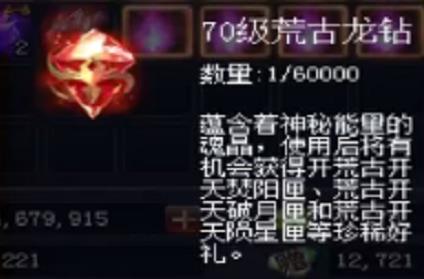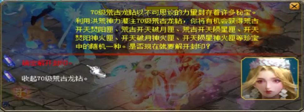 使用70级荒古龙钻解封秘宝,有机会获得荒古开天陨星匣、荒古开天破月匣、荒古开天焚阳匣、开天焚阳神火匣等随机好礼!